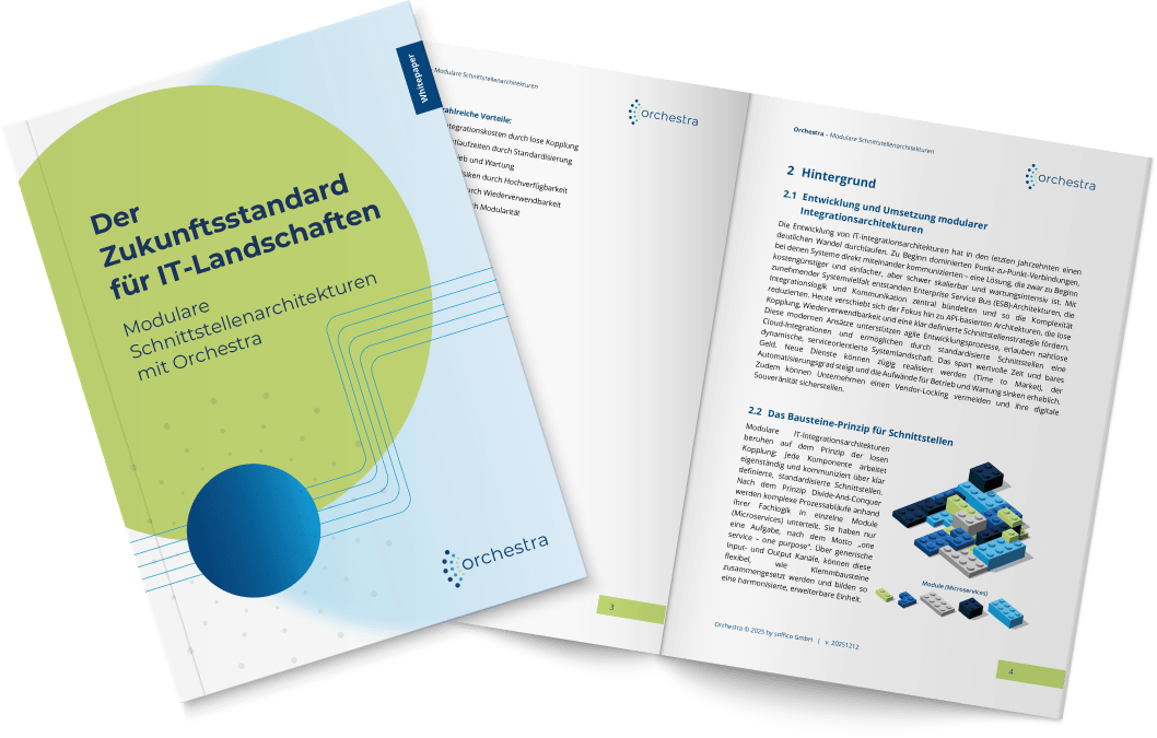 Dieses Whitepaper zeigt, wie modulare Schnittstellenarchitekturen mit Orchestra helfen, diese Komplexität gezielt zu reduzieren und eine zukunftsfähige Integrationsstrategie umzusetzen.